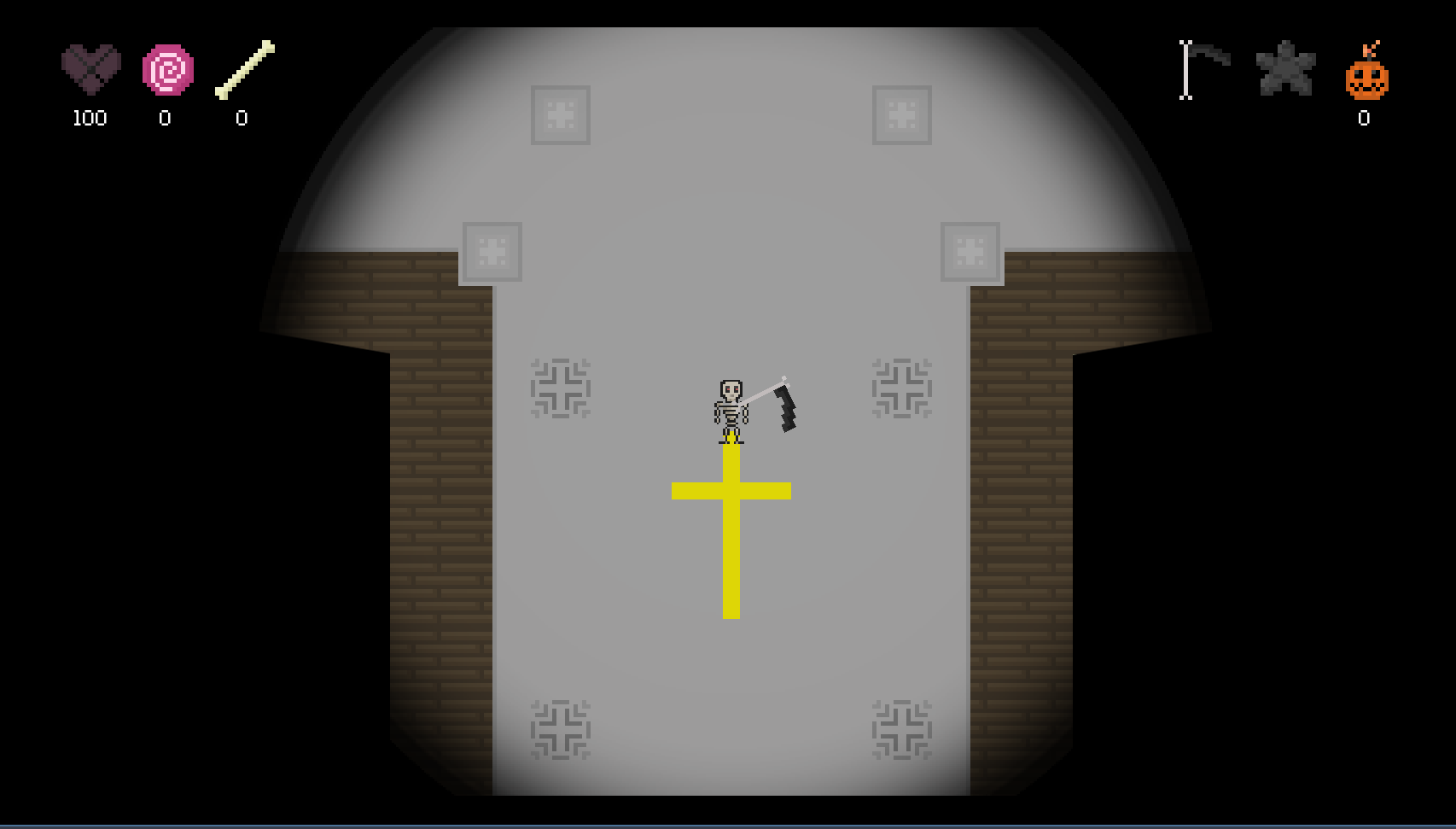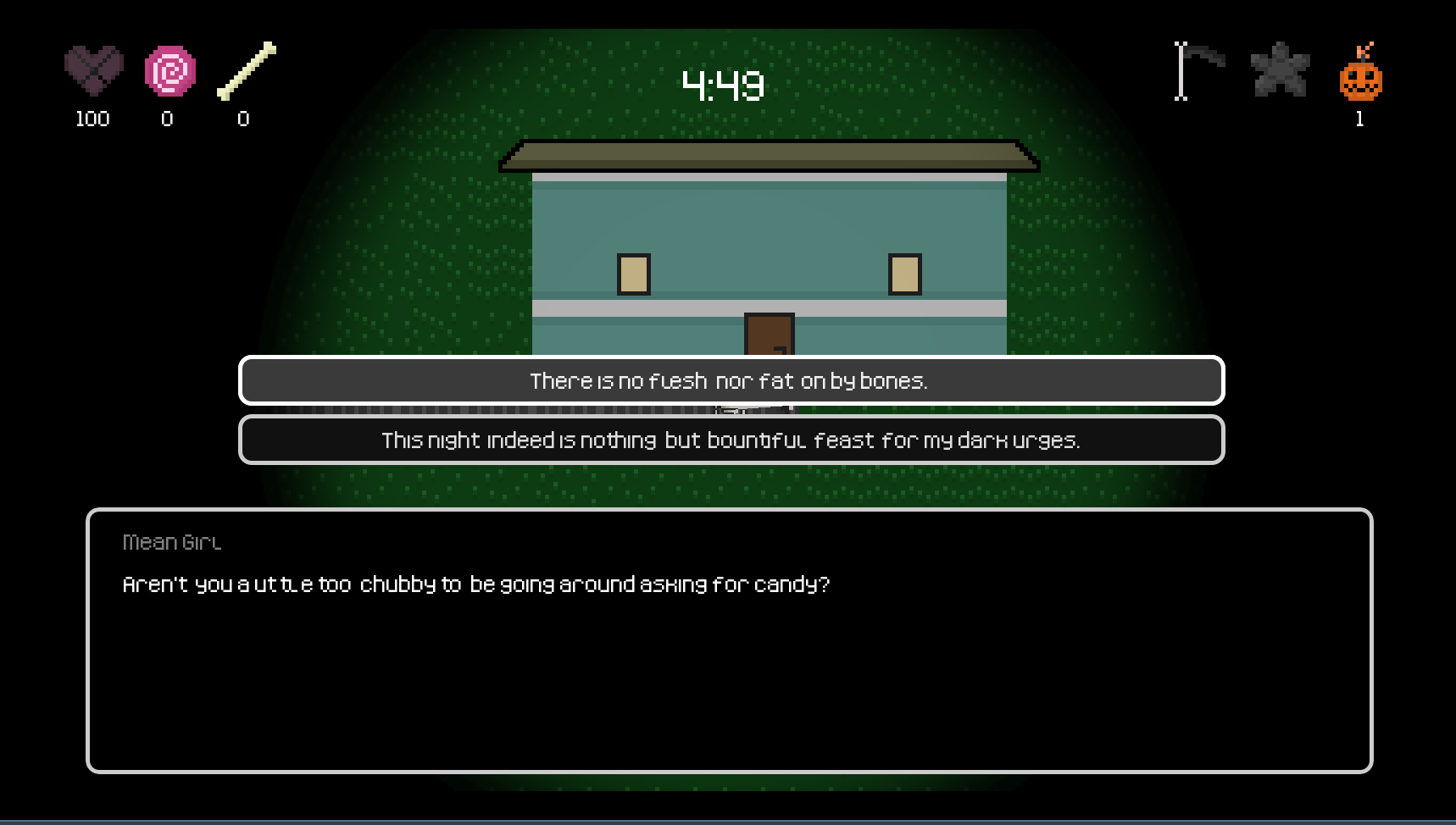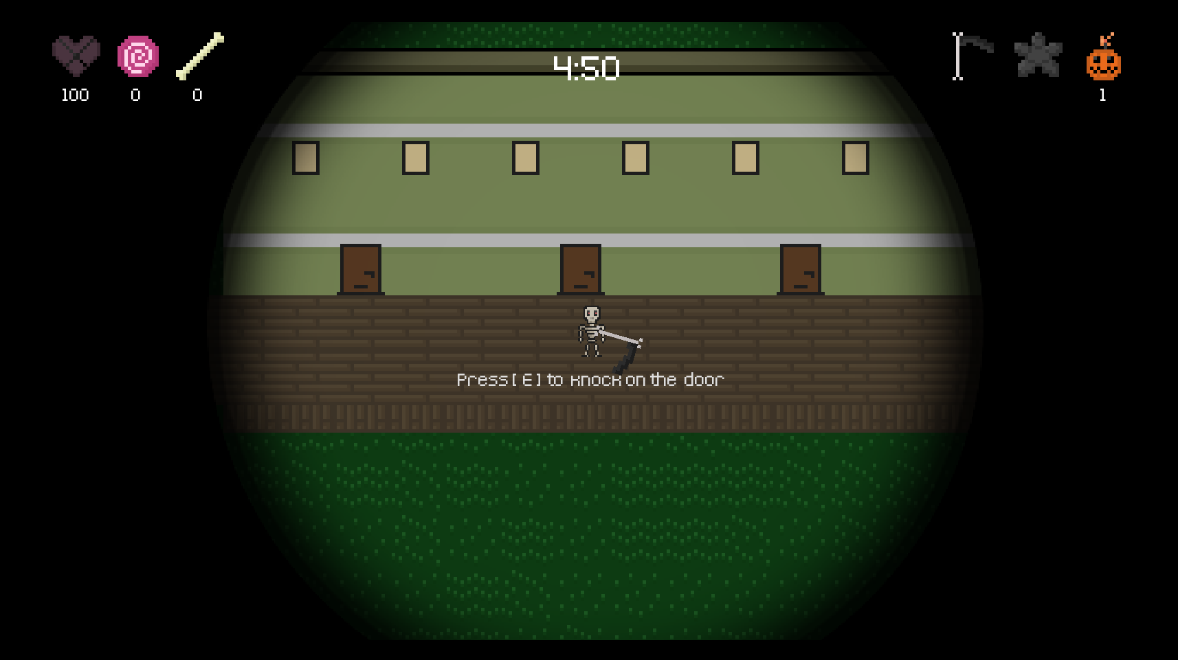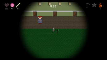 You play as a lone skeleton, trick or treating their way across a Halloween town. Get a treat or trick the unsuspecting citizens by taking their bones. Avoid the pious and get better weapons (the pentagram shuriken will unlock when you get 50 bones).